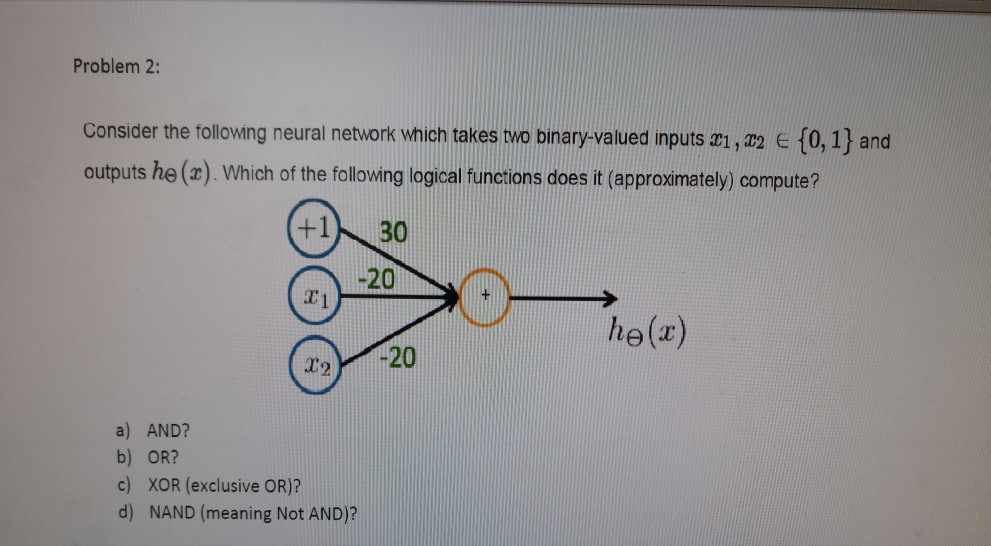 Then for any input x it must be the case that a 31 a 32 a 33 1. Which of the following logical functions does it approximately compute. Let a 31 h Θ x 1 be the activation of the first output unit and similarly a 32 h Θ x 2 and a 33 h Θ x 3.